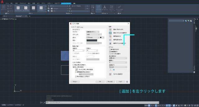 そうして柄を設定した上で[OK]で編集画面を閉じ、再度ハッチングする点やオブジェクトを選択することで、ハッチングを指定した柄で作成します。