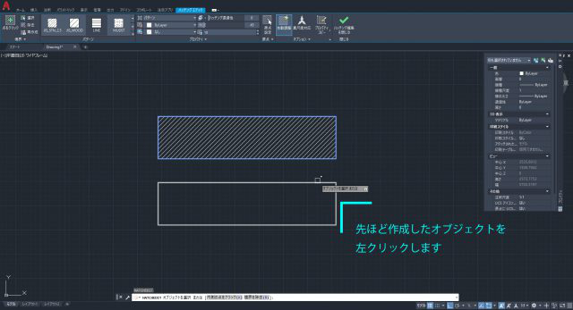 ② [ハッチングオブジェクトを選択]という文字案内が出ますので、作成したハッチングを選択します。