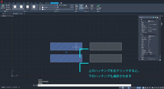 さて、この操作には、少しだけ重要なポイントがあります。それは、1つのハッチングデータで2つのオブジェクトをハッチングしているということです。