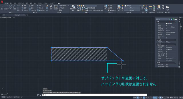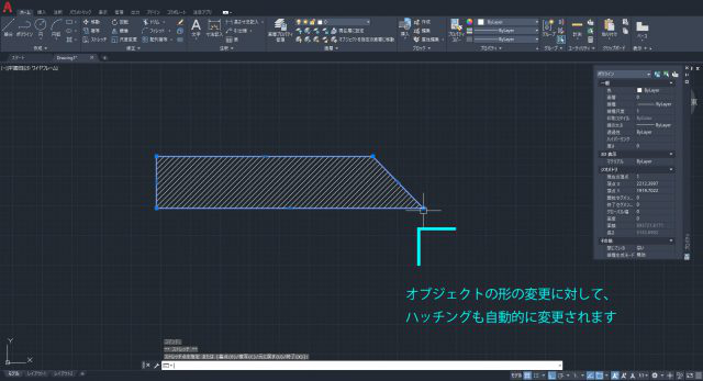 端部を左クリックし、マウスを移動させれば、オブジェクトの形を変更できます。すると、ハッチングも自動的に変更されることを確認してください。