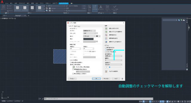 確認ができたら、ハッチング編集画面で、自動調整のチェックマークを左クリックにより解除します。[OK]で編集を完了させたら、先ほどと同じように、ハッチングをしているオブジェクトの端部を動かしてみましょう。