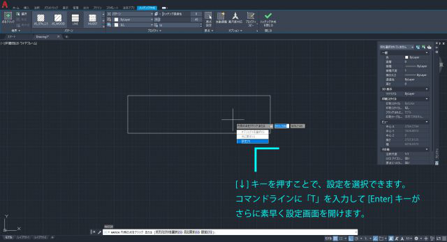 1つ目は、ハッチングコマンド実行時に、[↓]キーを押して、[設定]という部分をクリックすることで、ハッチング編集画面に移行する方法です。