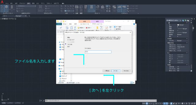 ファイル名を決めます。なんでも良いですが、この解説では「テスト」としておきます。[次へ]を左クリックします。