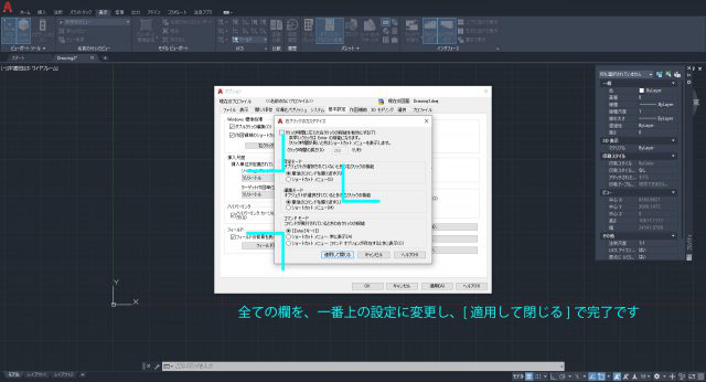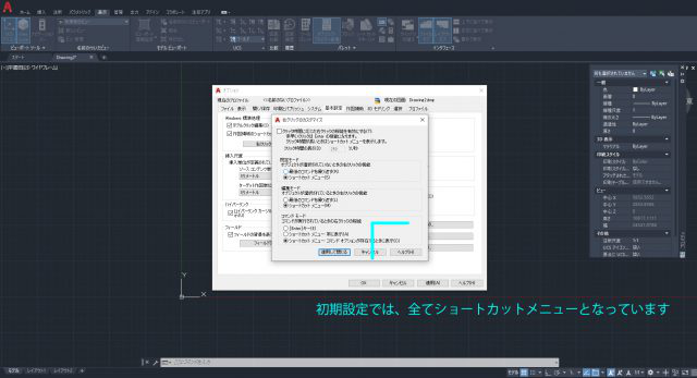 初期設定では、全てショートカットメニューになっていますが、ここの選択欄を全て一番上のものに変更することで、コマンド実行時やコマンド終了時の[Enter]キー操作を、右クリックで代用することが可能です。