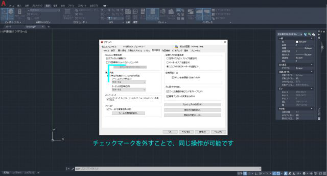 因みに、[右クリックをカスタマイズ]を押した画面に戻り、[作図領域のショートカットメニュー]の欄のチェックマークを外すことで、上記の内容が反映されますが、自由に設定できることを紹介する為に、あえて[右クリックをカスタマイズ]を選択してもらいました。