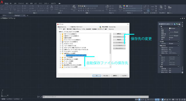 これを、AutoCADの自動保存と呼びます。この自動保存データは、データを探すことが難しいものありますので、自動保存の設定、保存場所を理解することで、バックアップも含めたデータ管理が可能となります。