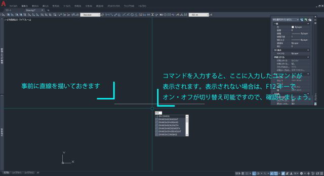 準備として、直線を引いておきます。ラインでもポリラインでも問題ありません。ラインの引き方は、別記事「作図基本① 線を描く」をご覧ください。