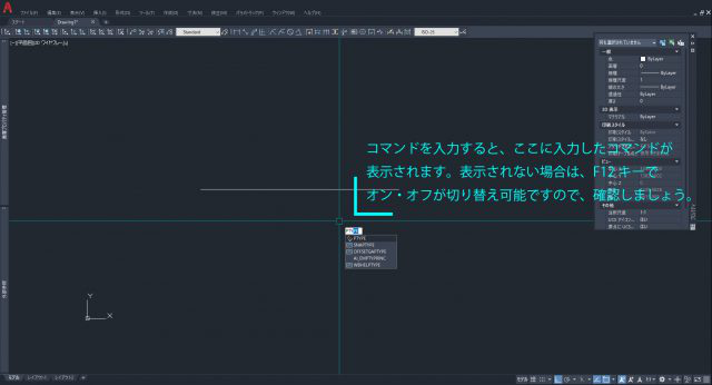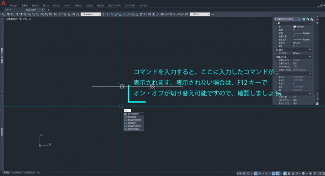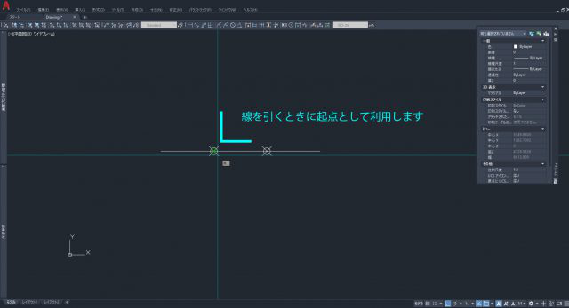 先程作成した「点」ですが、これを何に利用するのかというと、この「点」を起点として、新たな線を引くことが一般的です。ポリラインを実行し、起点として認識されるか確認してみてください。