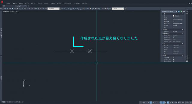 AutoCADの仕様なのですが、初期設定では「点」は画面上で見えにくい設定になっています。点の表示方法を変更させるには、コマンドラインに[PTYPE]と入力します。