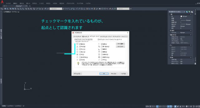 オブジェクトスナップという意味のエイリアスです。この設定で、「点」にチェックマークを付けましょう。