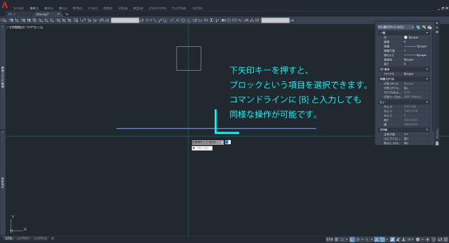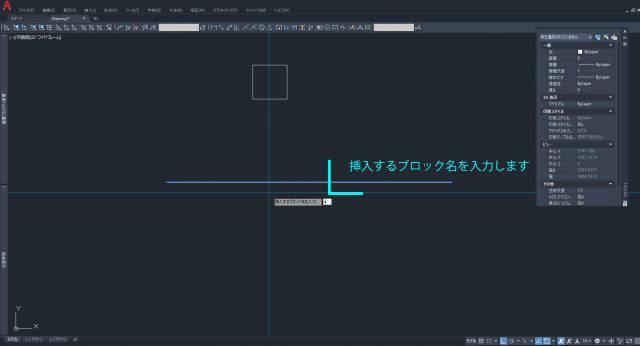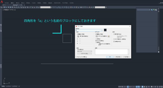 あまり使わない方法ですが、DIVIDEコマンドは、オブジェクトに「点」をプロットするだけでなく、「ブロック」を等間隔に配置することも可能です。準備として、先程と同様に直線を描いておきましょう。また、なんでも良いので、ブロックを作成します。ブロックの作成方法は、別記事「ブロックを作成し作図効率を上げる」で紹介しています。DIVIDEコマンドの都合上、ブロック名を入力する必要があるので、ブロックの名前は[a]等、簡単なものにしておいた方が良いです。