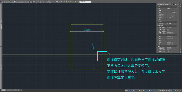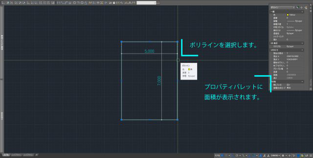 早速、ポリラインで先ほどと同じように、7m×5mの四角形を作成してみましょう。ポリラインの作成方法は、別記事「線を描く」で紹介しています。作成した四角形を選択して、プロパティパレットの面積欄を確認します。単位は平方ミリメートルなので、㎡で確認する為には、6桁移動する必要がありますが、見慣れれば間違えることは少ないです。