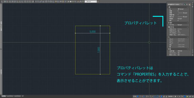 プロパティパレットはコマンドラインに「PROPERTIES」と入力することで表示可能です。
