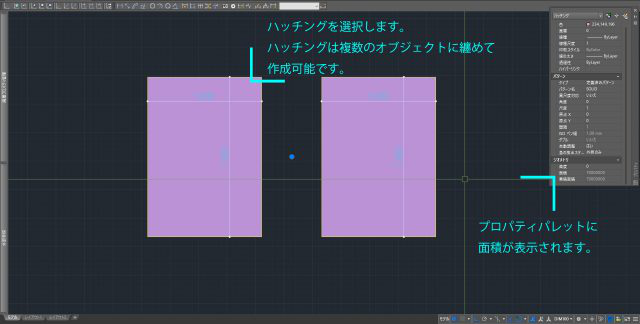 こちらも、ポリライン作成と同じように、プロパティパレットに面積が表示されます。ただし、ポリラインと違い、纏めてハッチングされている部分の面積を全て計算してくれるので、例えば、2つの四角形を纏めてハッチングすることにより、2つの四角形の面積を確認できます。ハッチングの作成方法は、別記事「ハッチングを作成する」で紹介しています。