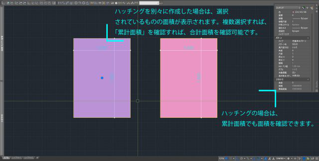 ハッチングを別々に作成した場合でも、それぞれのハッチングを複数選択することで、[累計面積]で合計面積を確認することが可能です。