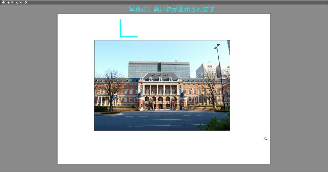先程挿入した画像を印刷プレビューで確認してみましょう。印刷プレビューの表示方法は、別記事「図面を印刷する」で紹介しています。印刷プレビューを確認すると、写真に枠が入っていることがわかります。