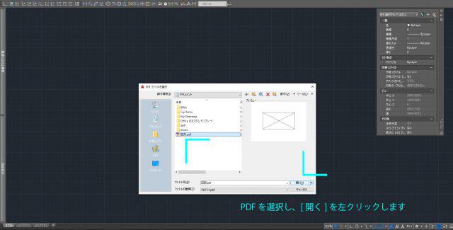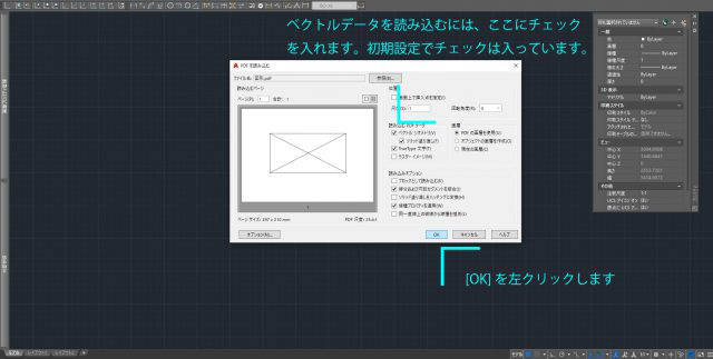 PDFを挿入するメリットは、PDFの種類によっては、線データをそのまま引き継げることです。もちろん、PDFの作り方によってあまりきれいにデータとして引き継げない場合もありますが、作図を進める下図として使い勝手が良い場合も多いので、やり方を知っておきましょう。
