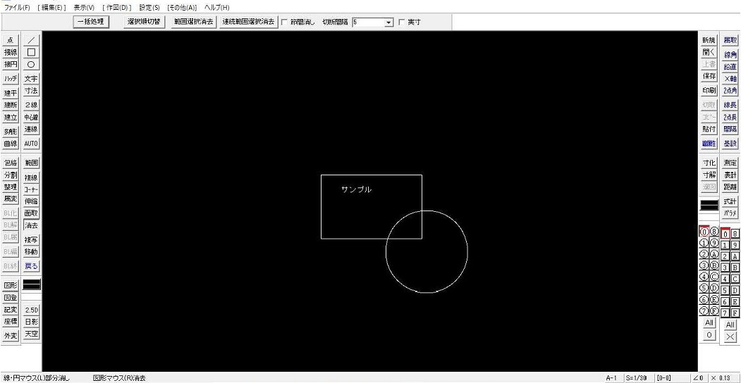 線を引く、円を描く、消去する、複写する、保存する、印刷するなどの各作業をワンクリックで行えるブロックの集合体です。自由に配置換え可能です。