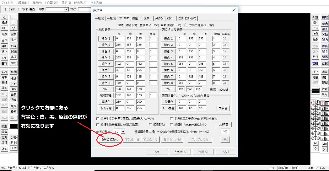 色・画面タブより下部にある、色彩の初期化をクリックします。すると背景色の選択が有効になります。