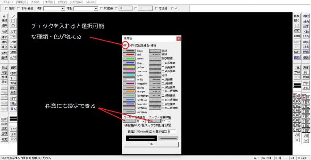 更にこの設定画面の中に希望の線種・線色がない場合は「SXF対応拡張線色・線種」にチェックを入れると、下記画面のように選択範囲が拡張されます。