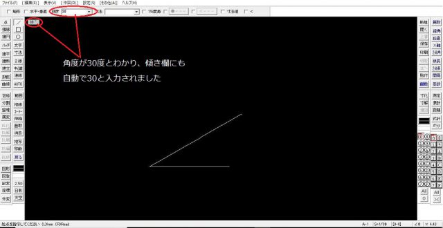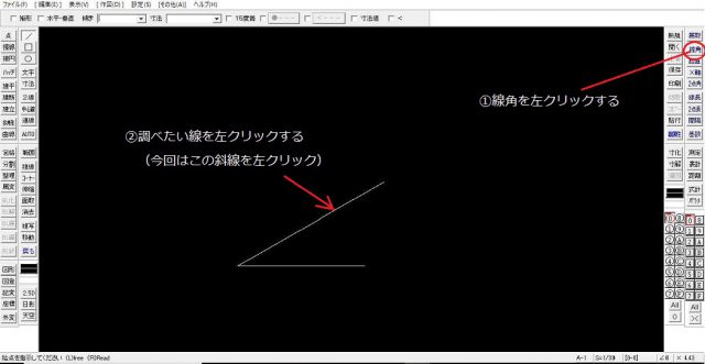 既にある線データに倣って新しい線を引こうとする際などに有効です。下の図の線角を左クリックすると線角度を調べられる状態になります。