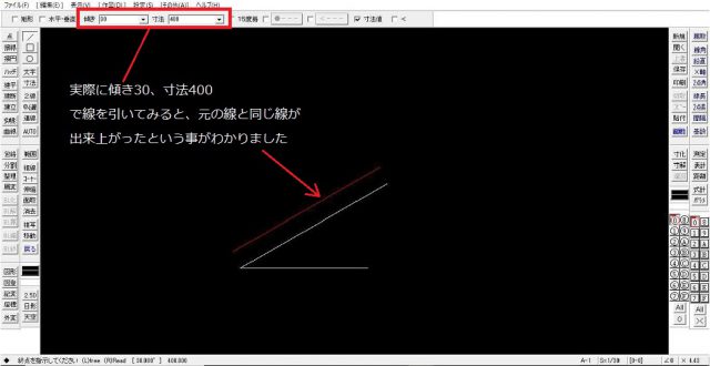 つまりこの斜線は400mm長さで30度傾いているという事がわかりました。