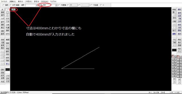 実際に寸法400、傾き30と数値を入れてみます。そうするとその指定している内容で引けた線が作業領域の中に出てきました。