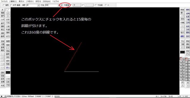 また、15度、30度、45度、60度、・・・・・と斜線を引こうとする際に15度毎に角度を変えた線に出来る操作もあります。