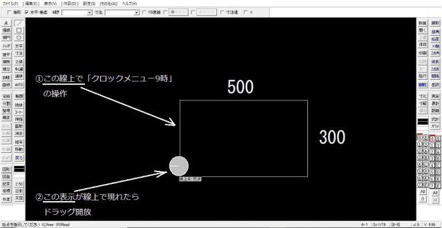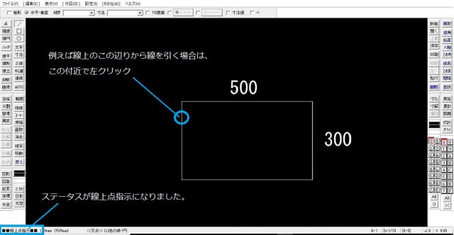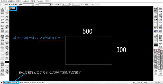例えば500×300の四角形300mmの線上、任意の場所からから別の線を引いてみます。