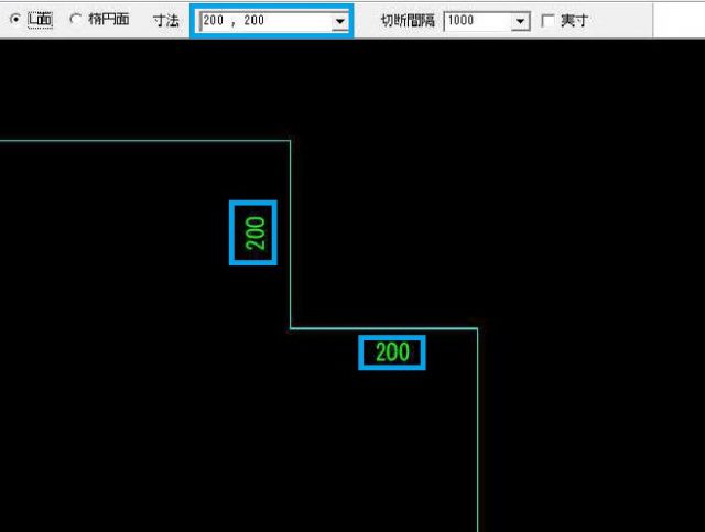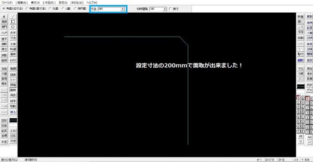 例えば角面(辺寸法)にチェックを入れての説明を上でしましたが、角面(面寸法)にチェックを入れると実際に仕上がった面取の面に対して設定寸法が反映されます。