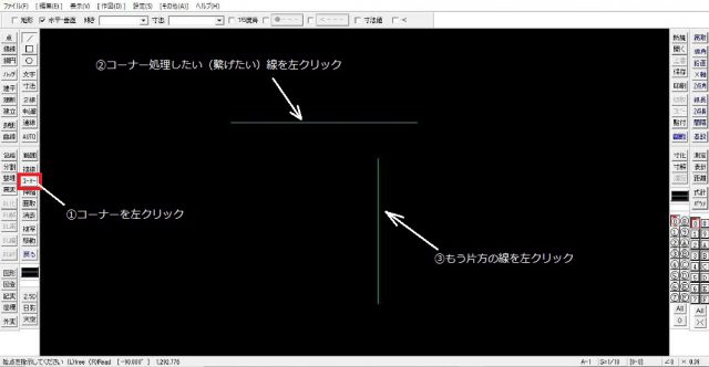 例えば下記の図面で違う方向を向いている二線を繋げてみたいと思います。先ずは「コーナー」をクリックします。