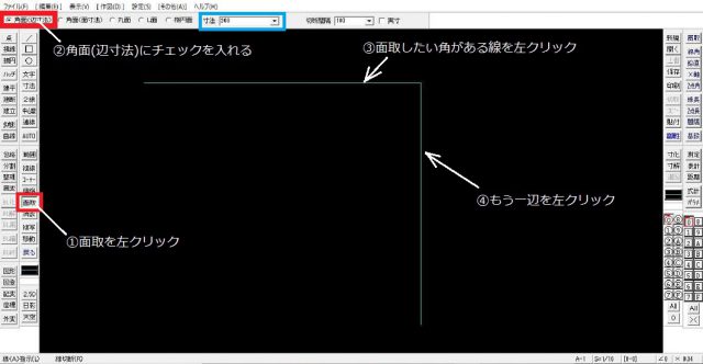 これも先に作図した図形を例に説明していきます。先ずは「面取」をクリックします。