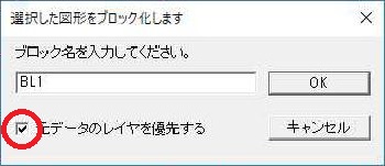 ブロック化後にレイヤーの集約が行われましたが、これを行わずもともとのレイヤーにパーツデータを残す場合には「BL化」をクリックした後に出るダイアログボックスで「元データのレイヤを優先する」にチェックを入れておけばOKです。