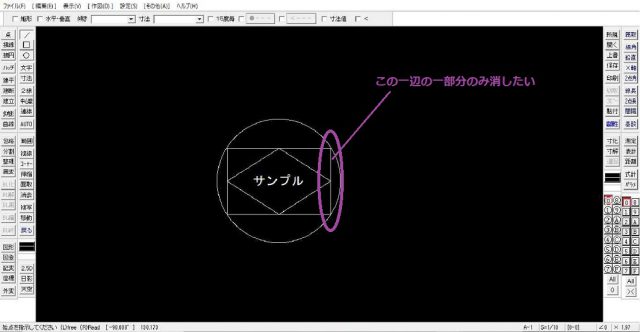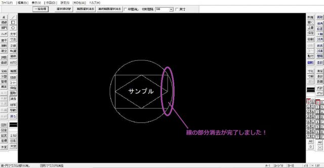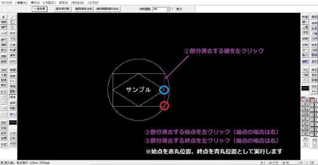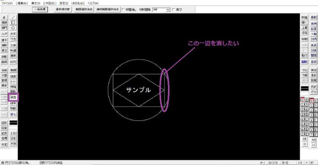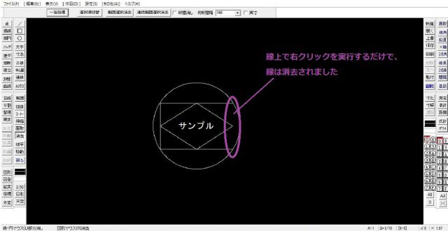 「消去」をクリックして消去コマンドにします。その後、消したい線上にて右クリックを実行します。