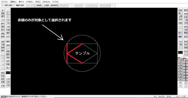 上図のように選択されるのでこの状態で例えば移動コマンドを行うと、この選択された赤線のみが移動の対象となります。