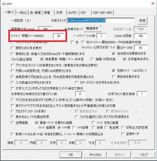 Jw_cadでも同様です。こまめに保存をしていった方がそういった思いがけないリスクは軽減できるのですが、このjw_cadには自動で保存をしてくれるという優れた機能があります。