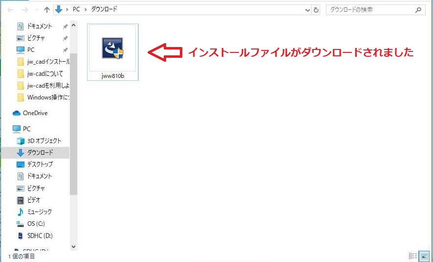 一番上に「jww810b.exeをダウンロードしています」とメッセージが出ますので、そのメッセージの通りjw_cadのインストールファイルをダウンロードしている状態になります。