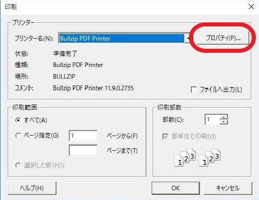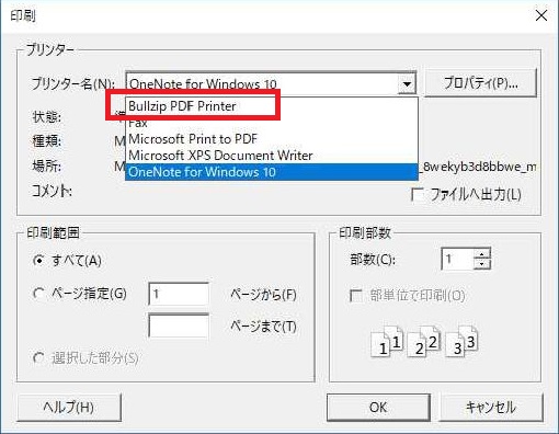 まずはプリンターの選択です。プルダウンから「Bullzip PDF Printer」を選択します。