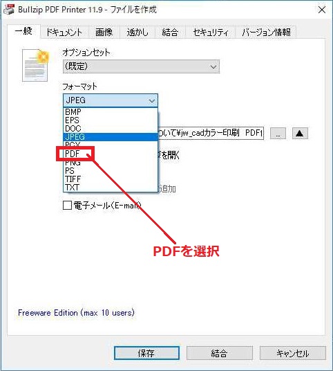 次はファイルの保存先、ファイル名の変更、ファイルの種類を選択です。今回は「PDF」が目的なので、ファイルの種類を「PDF」に選択して「保存」します。