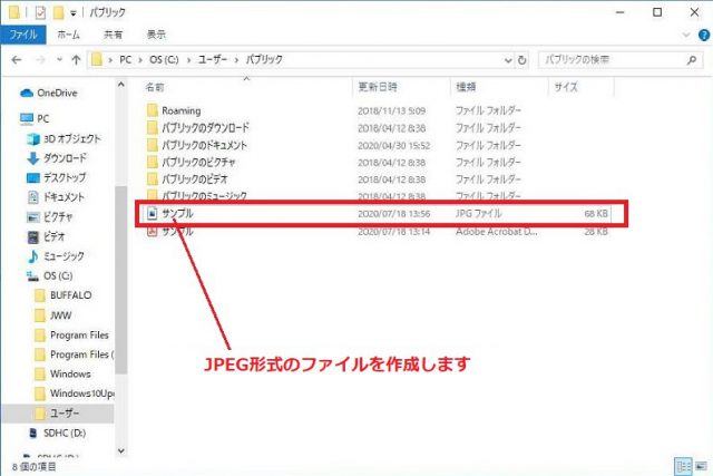 先ほど作成したJPEG形式の「サンプル」というファイルを選択します。