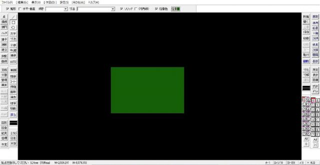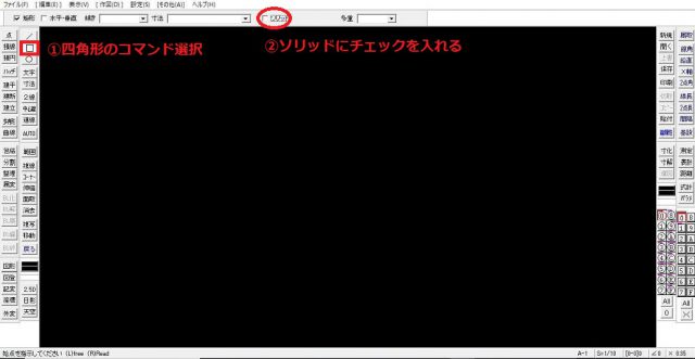 上図のように四角形を作図する状態にして、上部コントロールバーのソリッドにチェックを入れます。その状態で四角形を作図します。