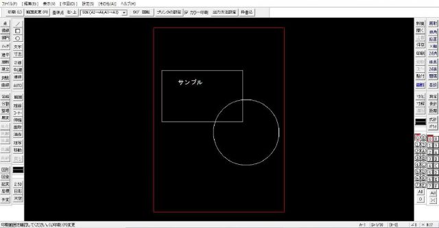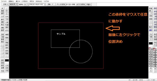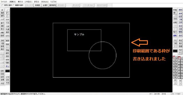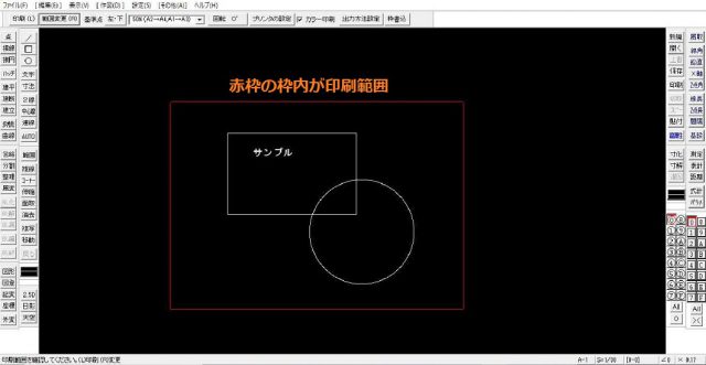 作図中でも「印刷範囲」がわかるように、赤枠の表示を実際に図形として書き込みます。(通常は赤枠は印刷コマンド実行時にしか表示されません)