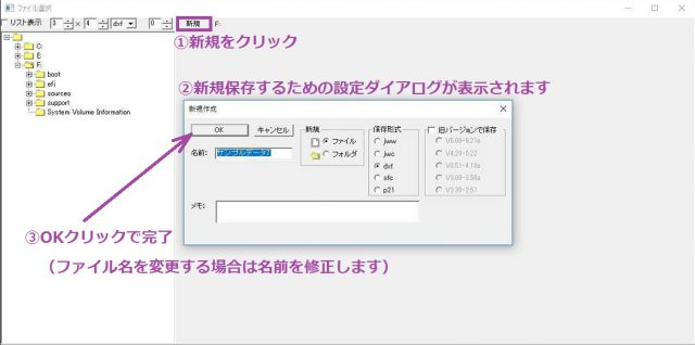 この(F)ドライブの直下に保存するよう進めていきます。そのまま「新規」をクリックします。すると保存するためのダイアログが表示されるので従って先に進めます。