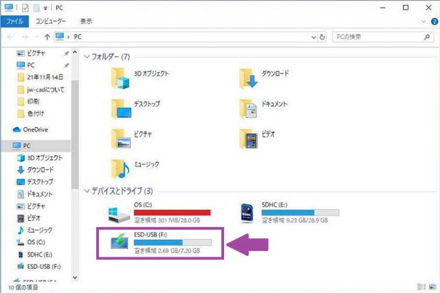 ここでは、USBメモリを(F)ドライブという認識で説明を進めていきます。