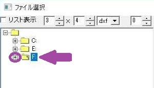 上図のように紫〇の+の箇所を左クリックするか紫矢印で指したフォルダのアイコンをダブルクリックするとその(F)ドライブの中身が展開されます。