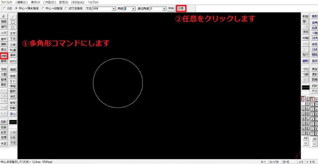 先ずは円を作成しましょう。その上で、多角形コマンドで をクリックします。