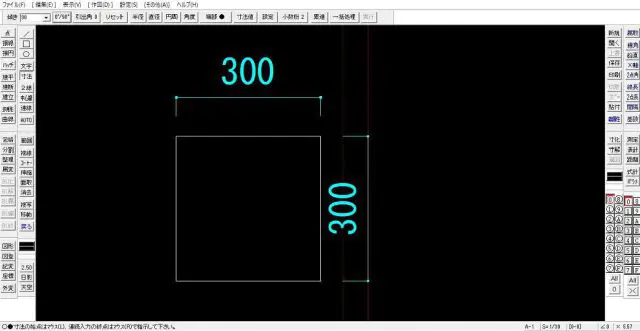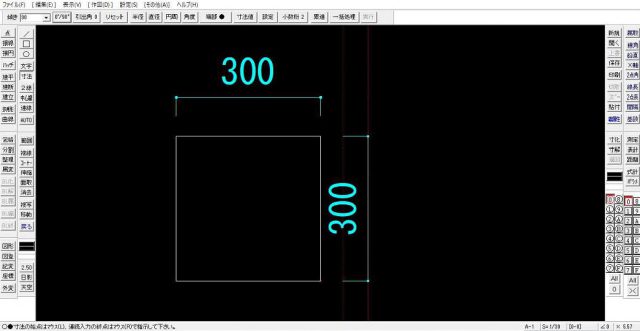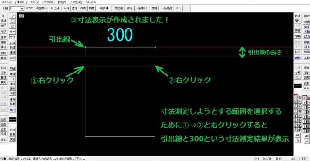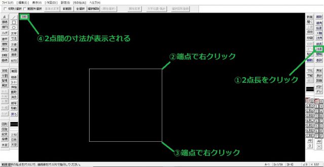 寸法コマンドは②2点長に似ています。②2点長の測定する範囲を選択するような操作は同じですが、それと同時にその寸法を図面上に作図します。