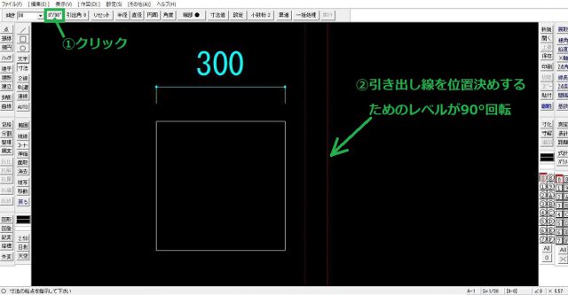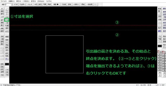 先ずは寸法コマンドを選択して寸法の引出線の位置と長さ(高さ)を決める操作をします。