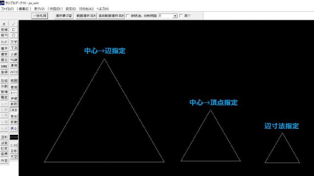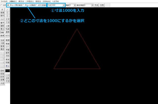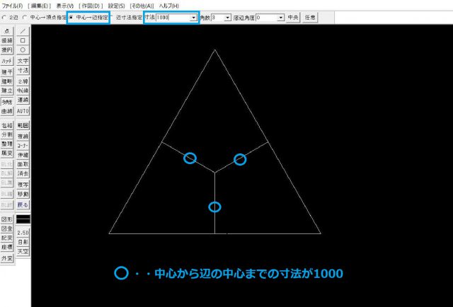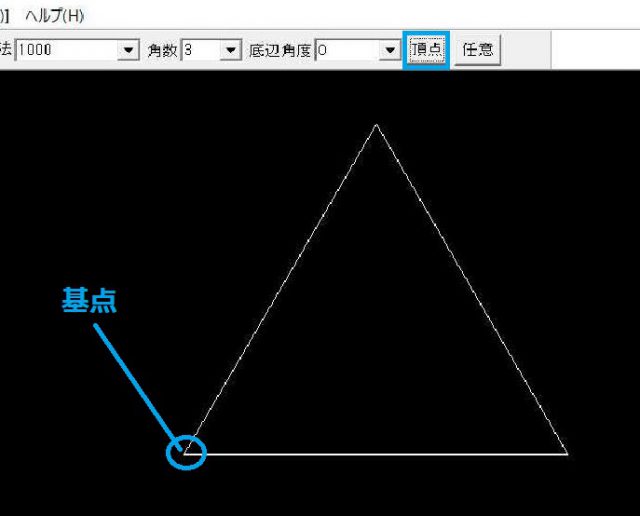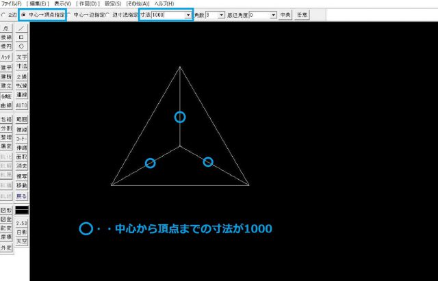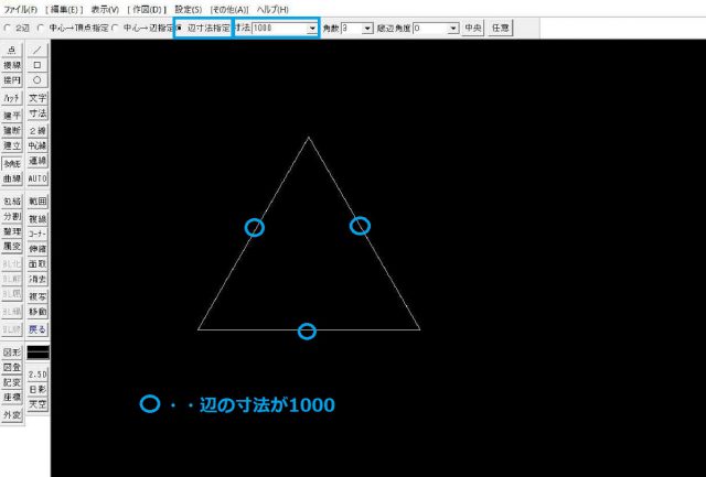 例として寸法1000の三角形を作成してみます。この時どこの寸法を1000にするかで三角形のサイズが変わります。