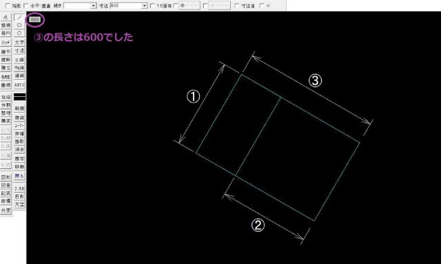 線一本まるごとを測定しようとする場合は「線長」、任意の区間を測定しようとする場合は「2点長」と使い分けて長さを測定することが可能です。この要領で③の寸法も測定できますが、この場合は「線長」でも「2点長」でもどちらでも構いません。(因みに測定すると600長さでした)